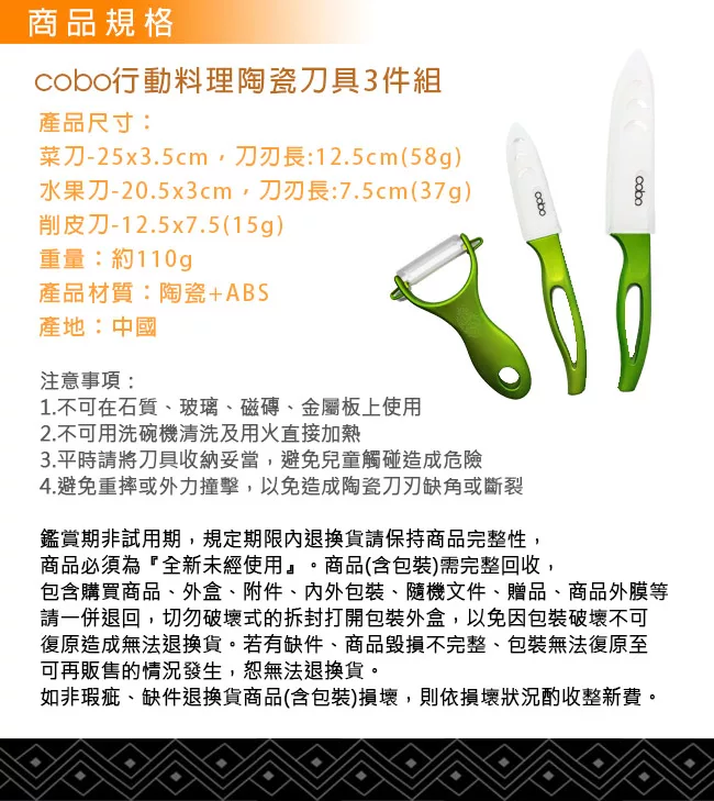 【cobo】行動料理陶瓷刀具3件組(削皮器+水果刀+菜刀) 評價